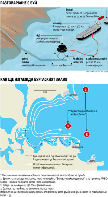 Infographic for Capital Weekly about a new buoy system that unloads oil near the coast and distributes it