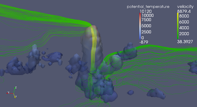 Visualization of an atmospheric dataset for the Data Visualization course at TU Delft. The graphic shows how air currents are moving fast through a cloud while cooling off.