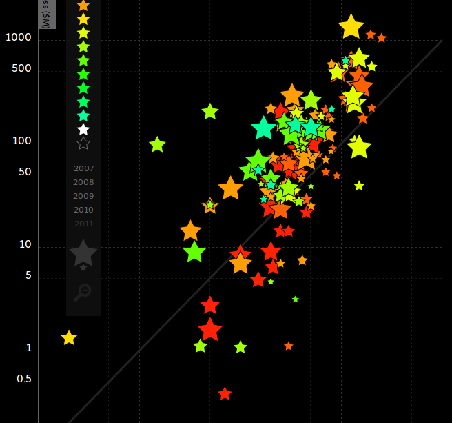 Hollywood Examiner is an interactive infographic that displays award-winning films by their budgets and income.It is possible to look at how the movie landscape changes through the years dynamically zooming, selecting categories, etc. Participated in Information is Beautiful in 2012.