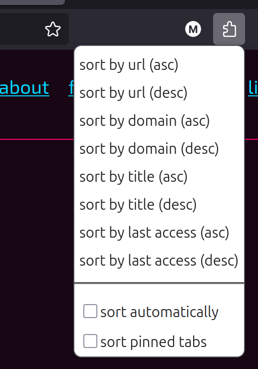 Firefox addon to sort tabs by different criteria.Check it out on github.